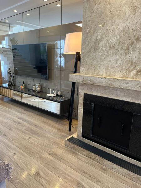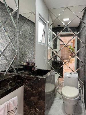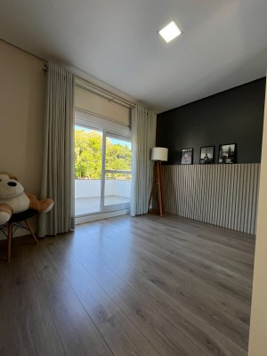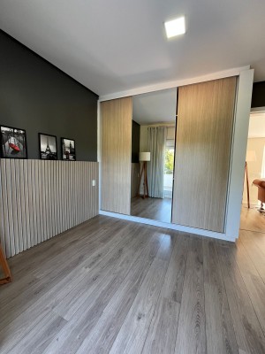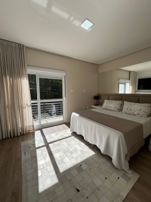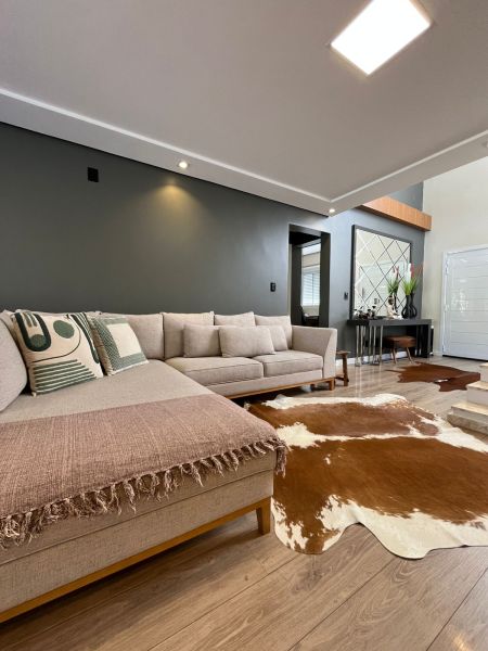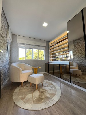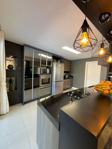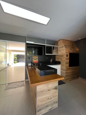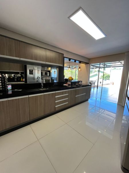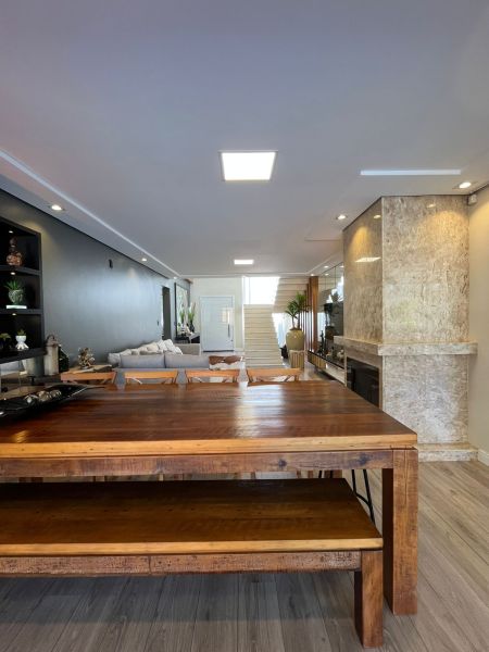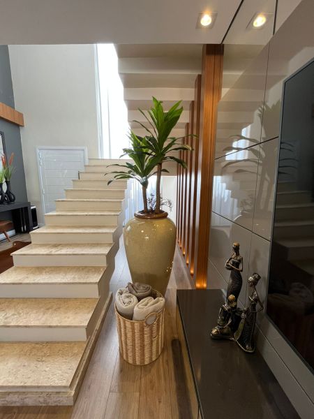 Com dois pavimentos, no andar térreo possui: Sala dos ambientes com Lareira, Cozinha americana, Lavabo, Escritório.