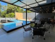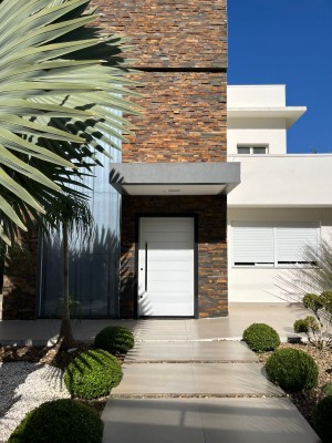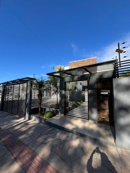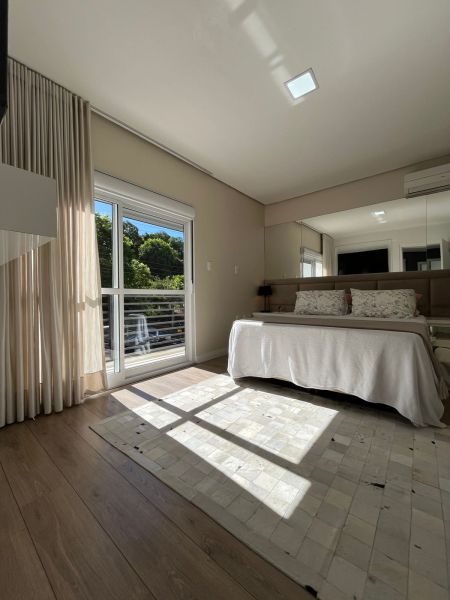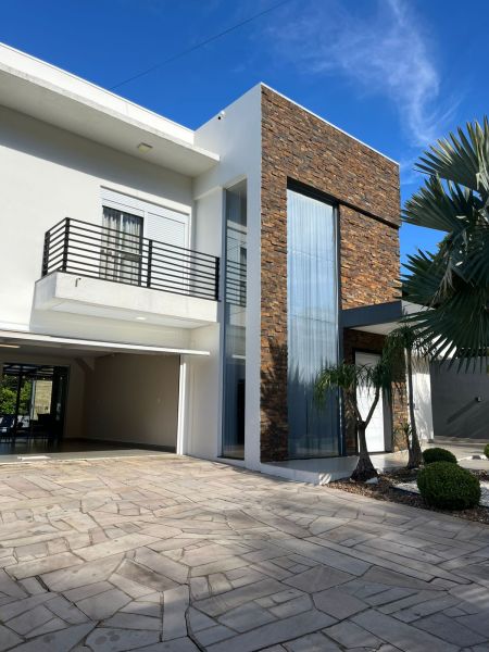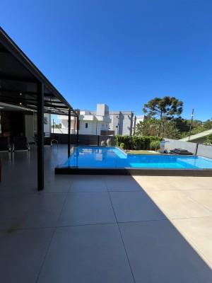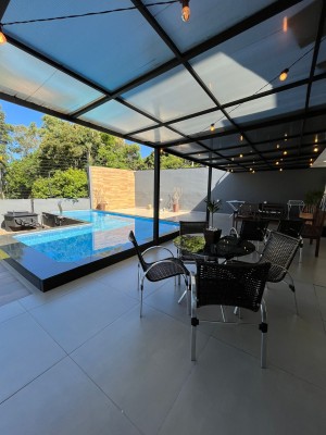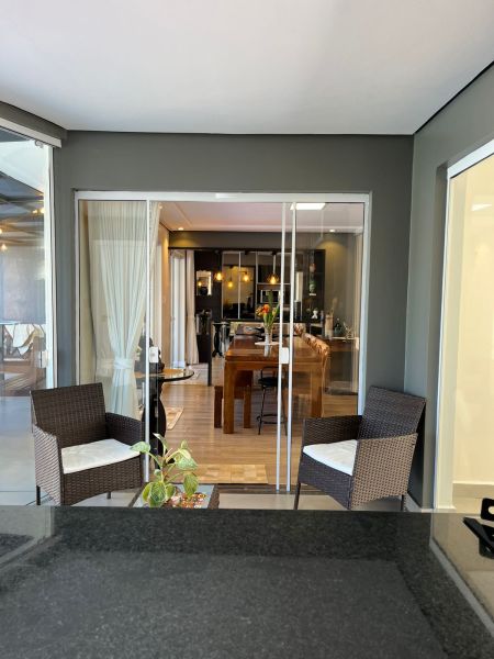 Na Área Externa, possui uma área gourmet, que pode ficar integrada ou separada da parte interna do imóvel, sendo dividida por porta de vidro. Com Piscina com aquecimento, lavabo externo, garagem para até 6 veículos grandes, pátio de fundos com jardim, espaço para adega/ sala de jogos ou depósito e área de serviços separada. Possui sistema de 20 placas solares.